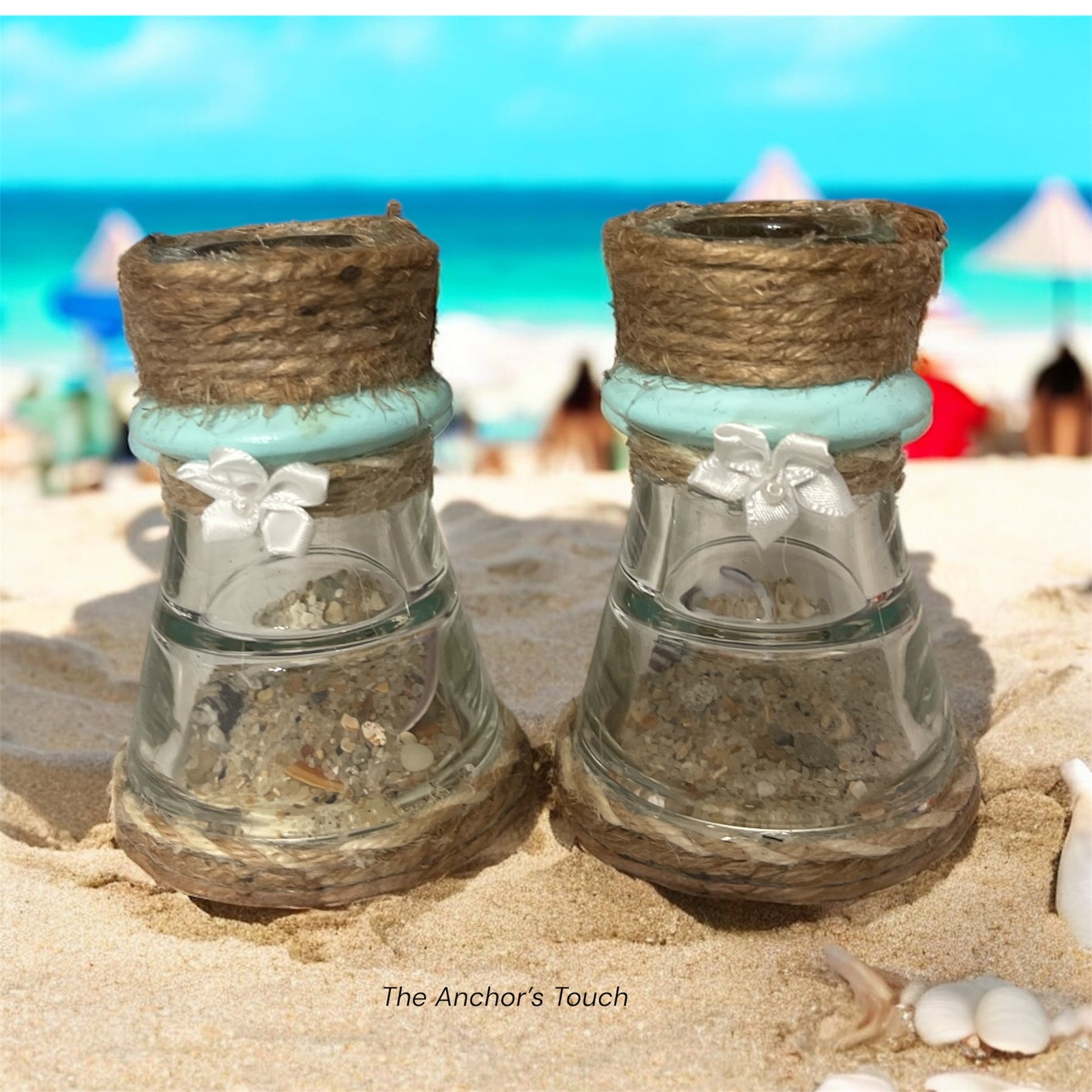 Bring a splash of the seaside inside with these charming Coastal Candlesticks. Hand-decorated with twine and crowned with a delicate white flower, each piece is filled with genuine sand and shells collected from the local beach. Perfect for adding a playful, beachy vibe to any room, these candlesticks bring sunny shore memories straight to your home.